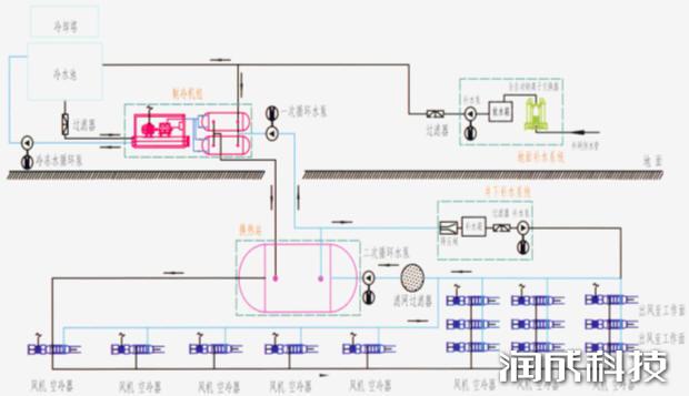 地面集中式冷水降温系统基来源理是使用地面制冷机组制备冷冻水,,,,,,使用冷冻水作为冷煤,,,,,,通过隔热管路运送到井下实现降温的目的。。。。。。。适用于开采深度大,,,,,,超温事人情数目多,,,,,,漫衍较广,,,,,,需冷量大的热害矿井,,,,,,能够知足整个矿井的降温需要。。。。。。。